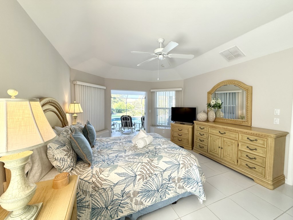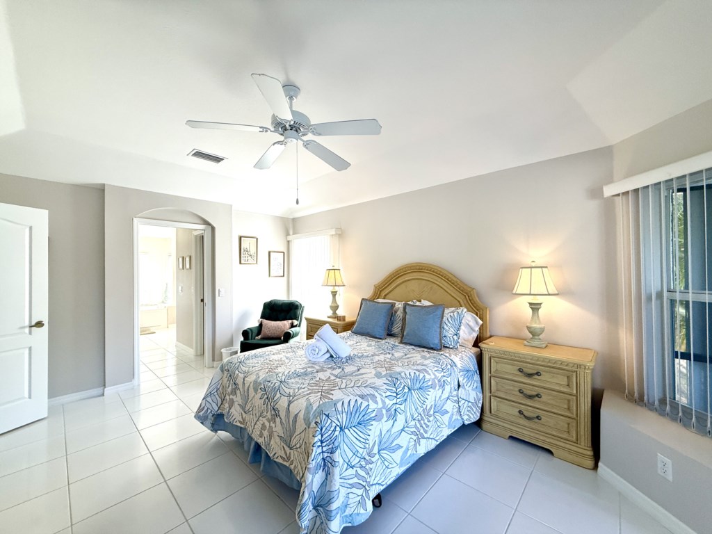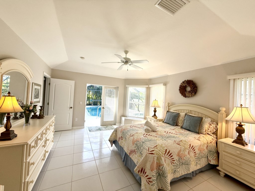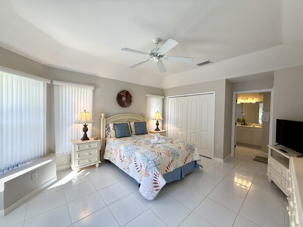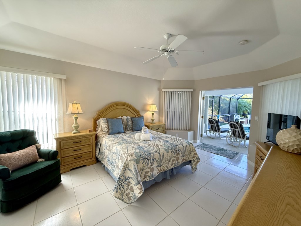 What sets this home apart? Dual primary suites, each positioned on opposite wings of the house for maximum privacy. Both suites feature queen beds, flat screen TVs, luxurious en-suite bathrooms with dual vanities, walk-in showers, and dreamy soaking tubs. And yes—both suites open to the pool area so you can start every morning with coffee and peaceful water views. The two guest bedrooms are equally inviting, each with twin beds and flat screen TVs—perfect for kids, teens, or friends traveling together. They share a convenient Jack-and-Jill bathroom with a single vanity and a shower/tub combo. Convenience meets comfort with a dedicated pool bathroom featuring a walk-in shower, pedestal sink, and direct access to the lanai, so you can rinse off after a swim without tracking through the house.