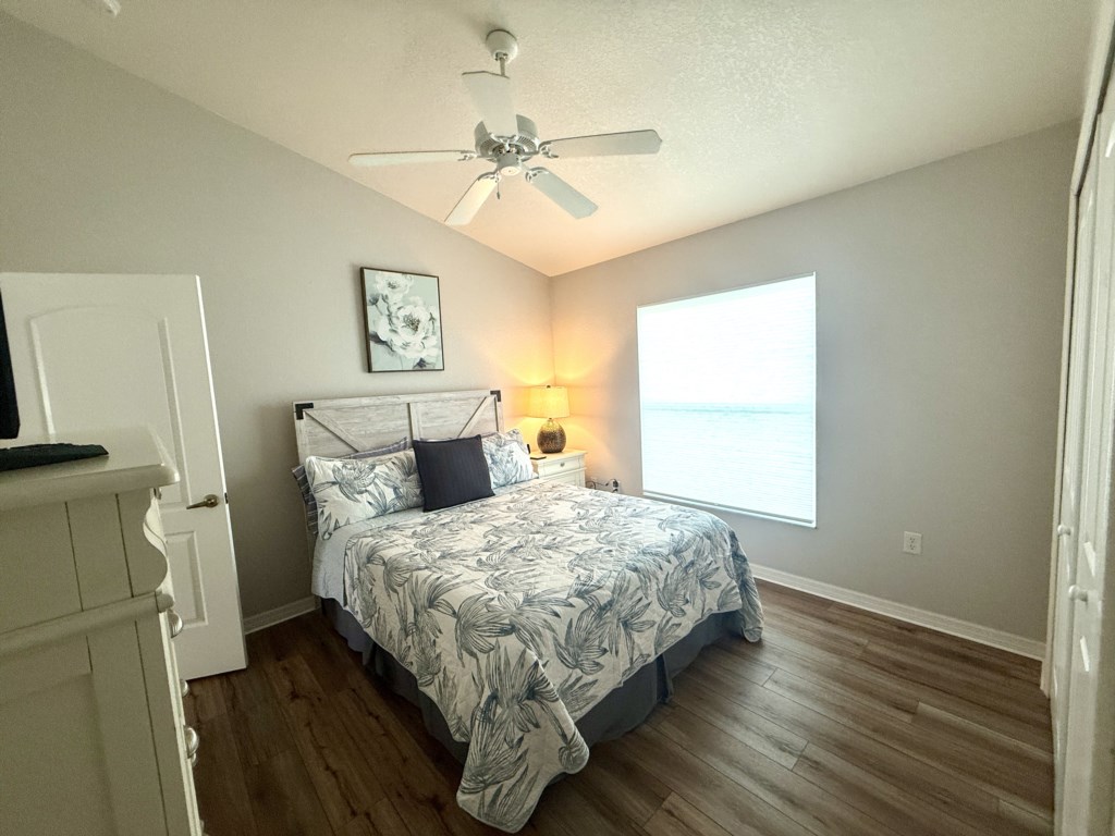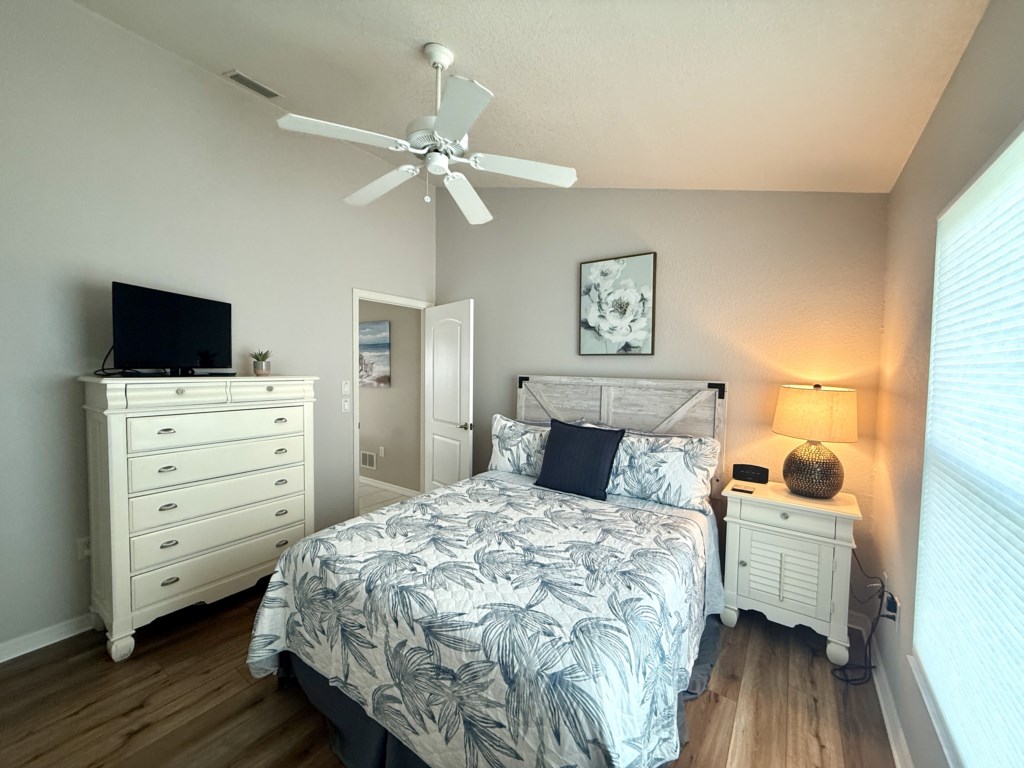 Wake Up to Water Views – Two Stunning Primary Suites! Retreat to comfort and privacy with a split floor plan that features two luxurious suites, both with direct access to the lanai and pool area—and of course, those breathtaking water views! The primary suite is a tranquil haven with a king bed, flat screen smart TV, walk-in closet, and a spa-like en-suite bathroom featuring dual sinks, a walk-in shower, and a beautiful soaking tub—perfect for long, relaxing soaks after a day in the sun. The second suite is equally inviting, with another king bed, flat screen TV, and a private bathroom offering dual sinks, a walk-in shower, and a separate soaking tub. Wake up to the peaceful shimmer of the lake and start your day in pure serenity. The third bedroom offers a comfortable queen bed and a flat screen TV, while the fourth bedroom also features a queen-size bed, making it great for guests of all ages. The shared family bathroom includes a single vanity and a shower-over-tub combination—perfect for refreshing after a day of beachside adventures. For added convenience, the dedicated pool bathroom features a pedestal sink, walk-in shower, and direct access to the lanai—perfect for rinsing off after a dip without ever stepping through the main living area.
