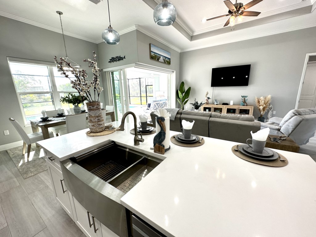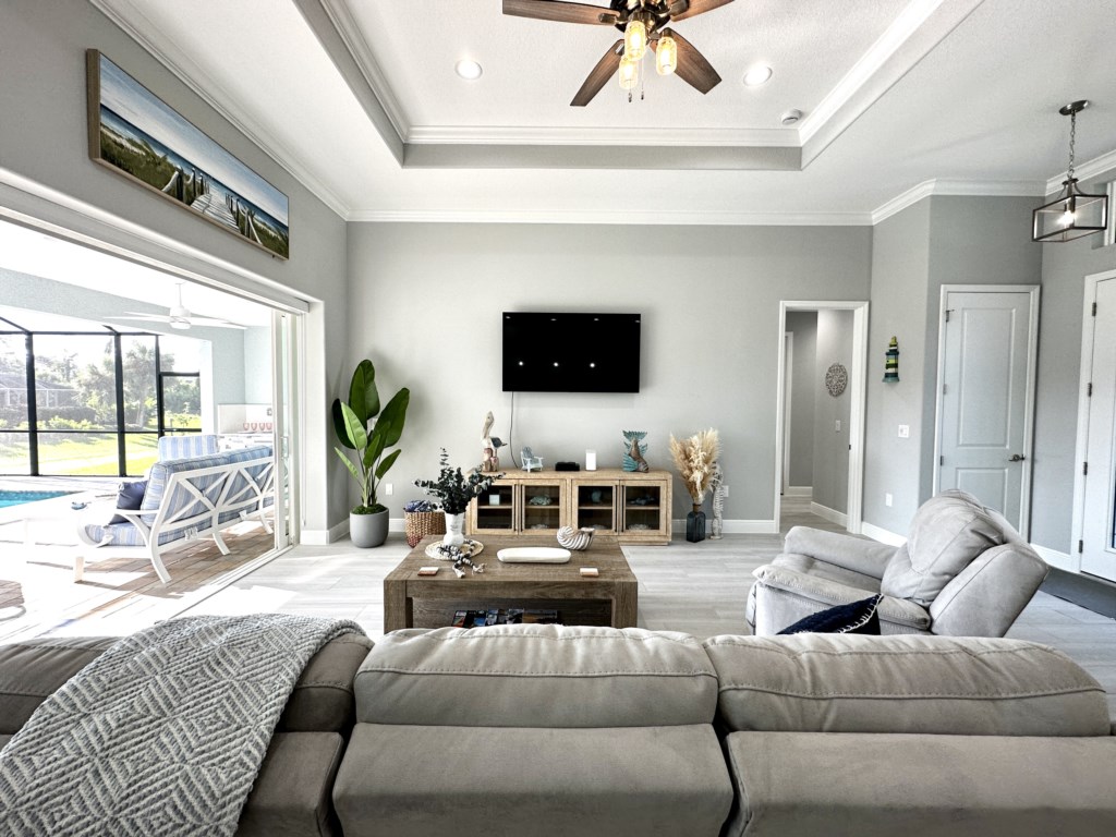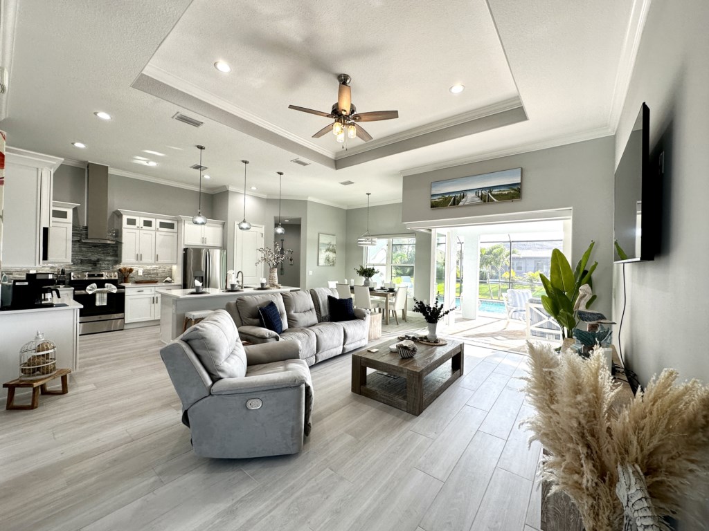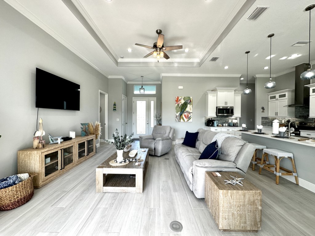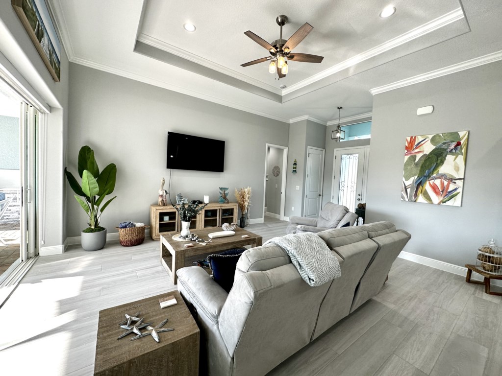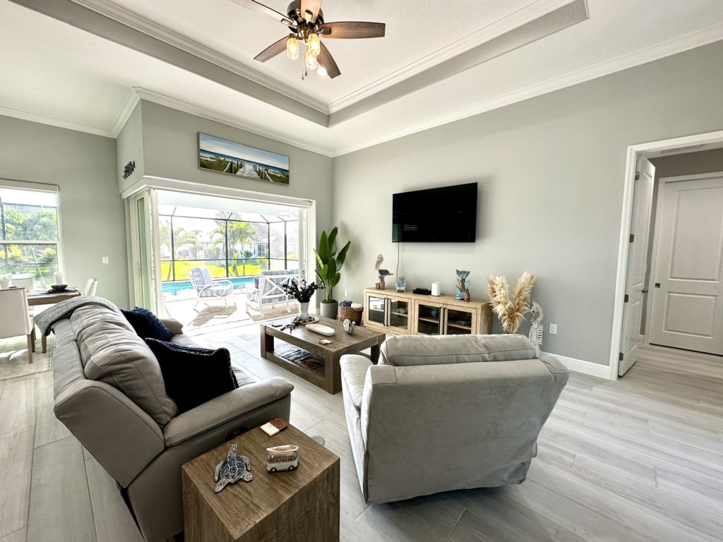 As you enter through the front door, you’re greeted by a bright and spacious living room featuring soaring tray ceilings and large pocket sliding glass doors that open to your own tropical oasis. The chic, modern furnishings in calming neutral tones create the perfect space to unwind—whether you're catching up on your favorite shows on the oversized flat-screen TV or curling up with a good book poolside.