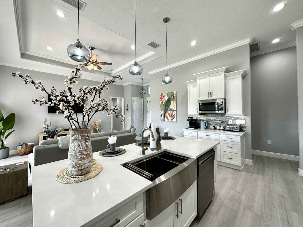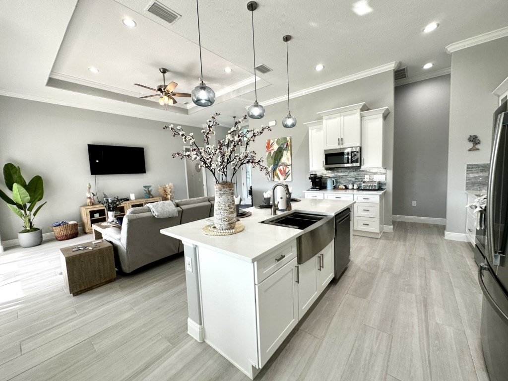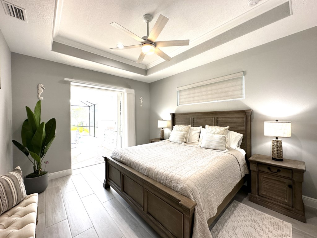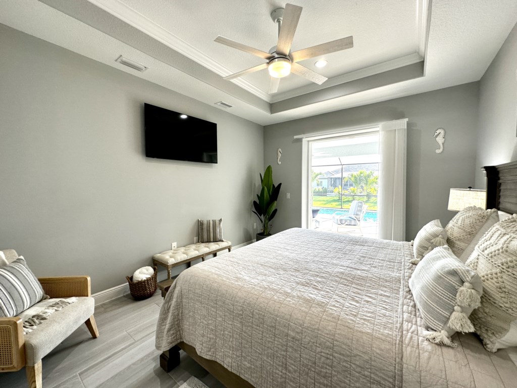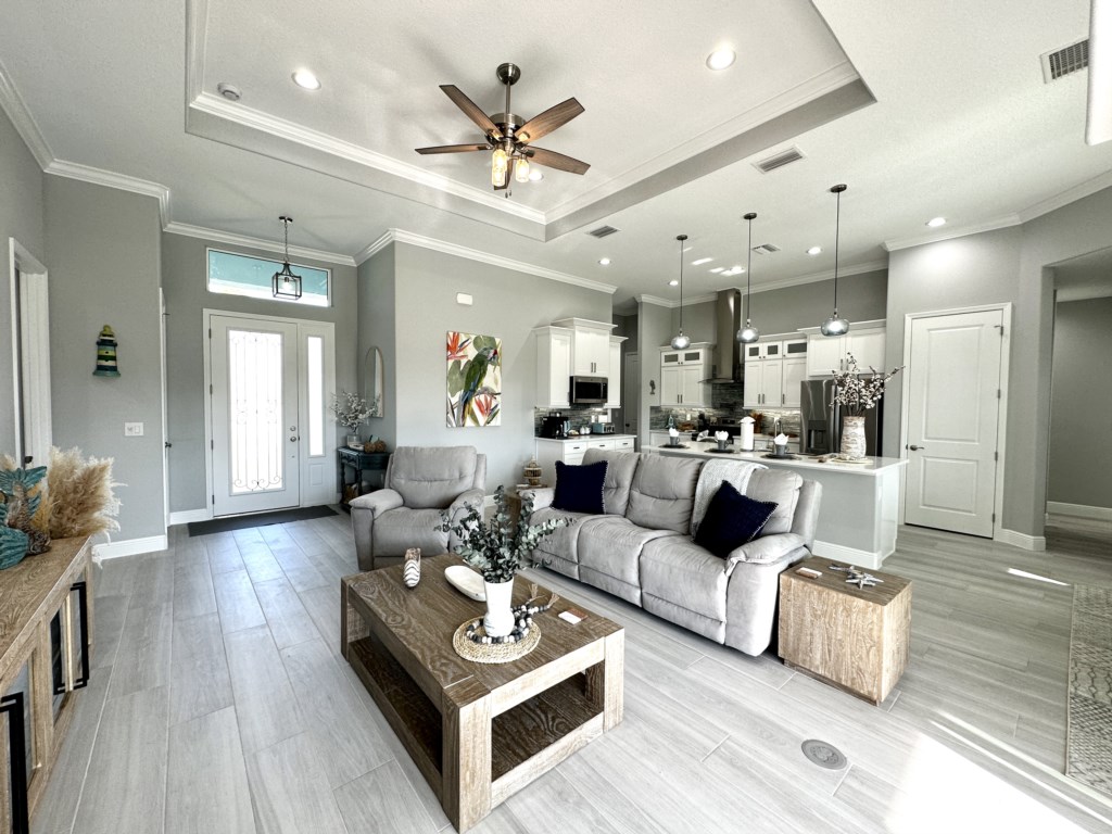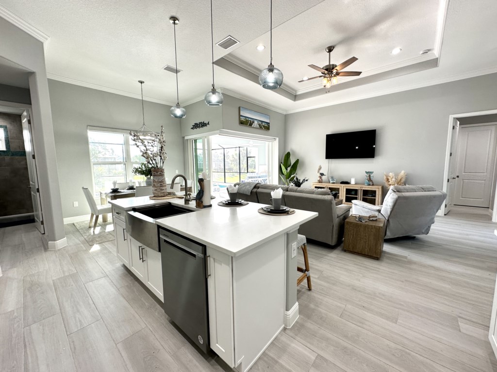 As you enter through the front door, you’re greeted by a bright and spacious living room featuring soaring tray ceilings and large pocket sliding glass doors that open to your own tropical oasis. The chic, modern furnishings in calming neutral tones create the perfect space to unwind—whether you're catching up on your favorite shows on the oversized flat-screen TV or curling up with a good book poolside.