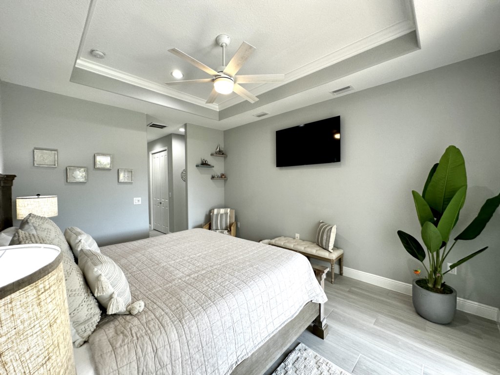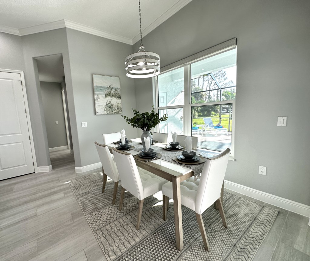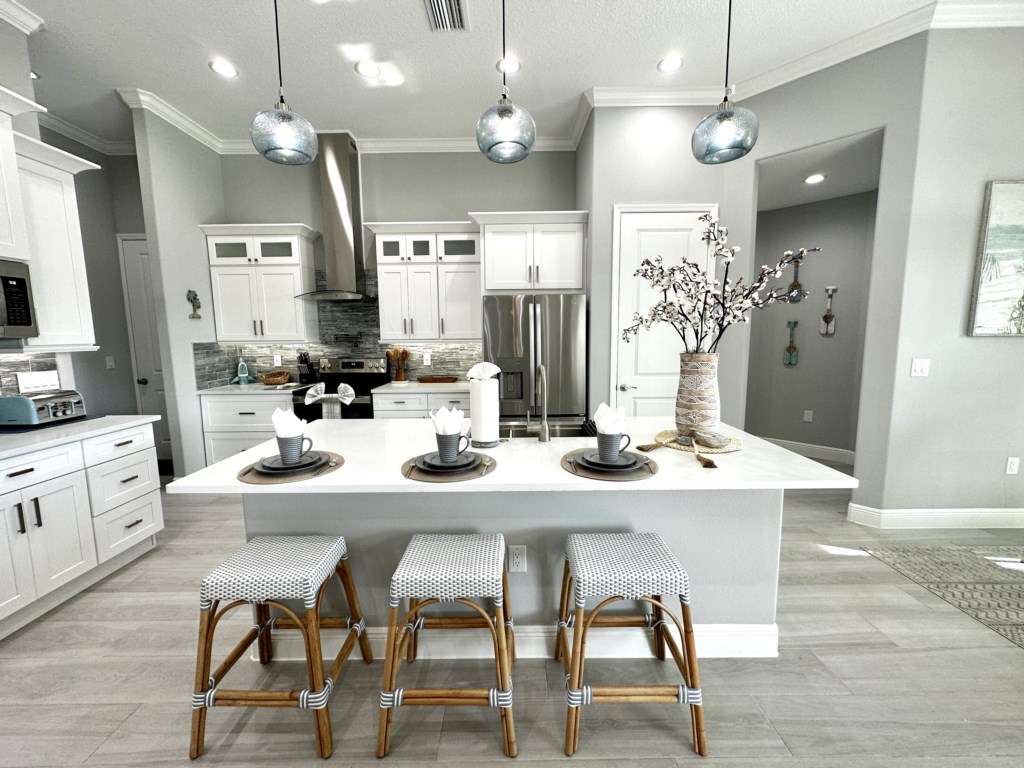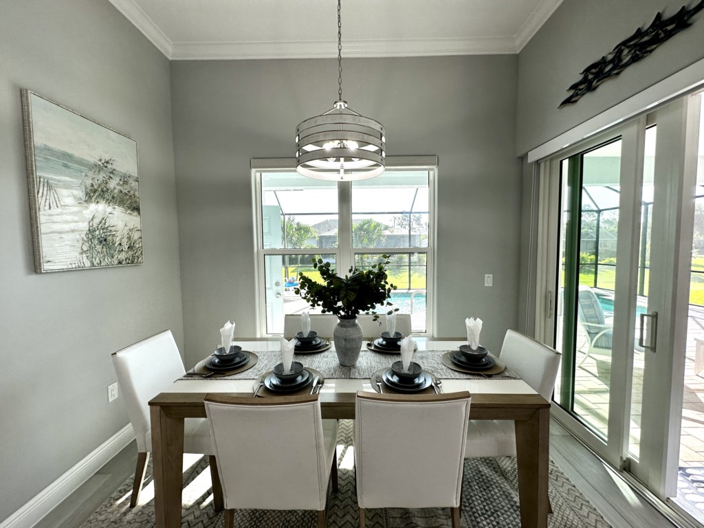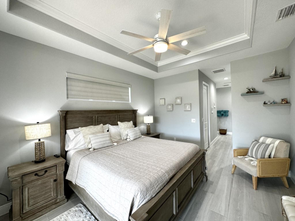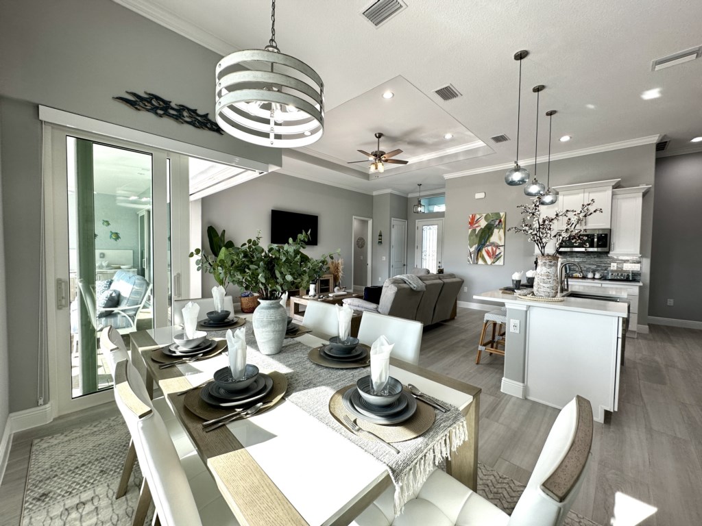 As you enter through the front door, you’re greeted by a bright and spacious living room featuring soaring tray ceilings and large pocket sliding glass doors that open to your own tropical oasis. The chic, modern furnishings in calming neutral tones create the perfect space to unwind—whether you're catching up on your favorite shows on the oversized flat-screen TV or curling up with a good book poolside.