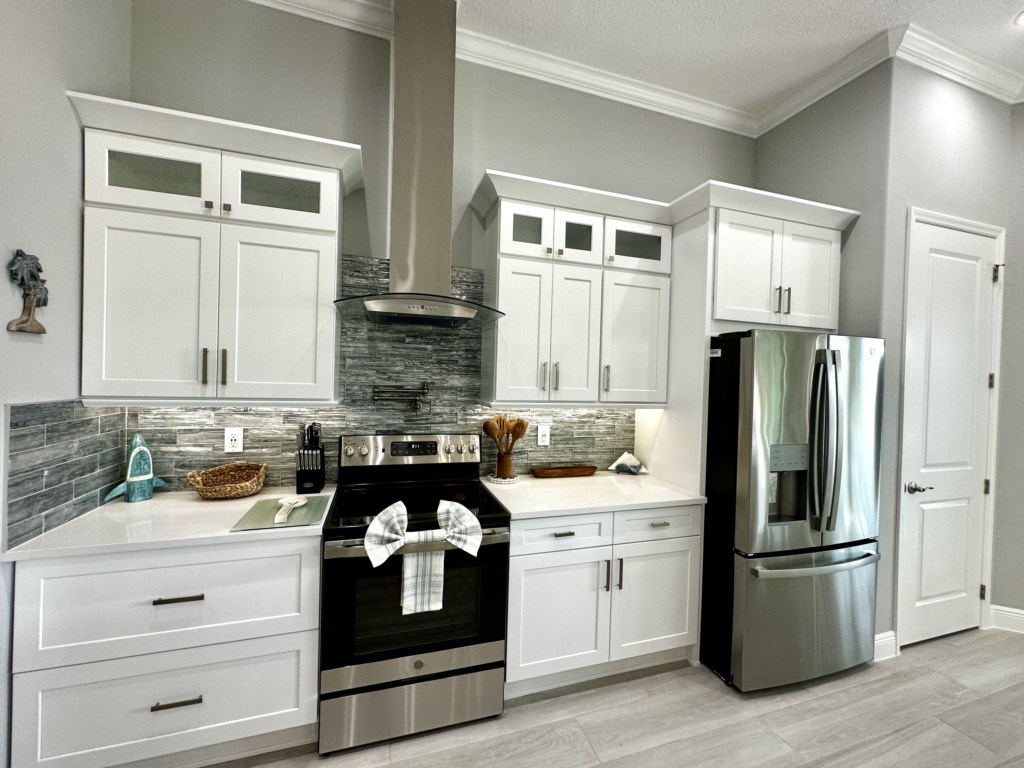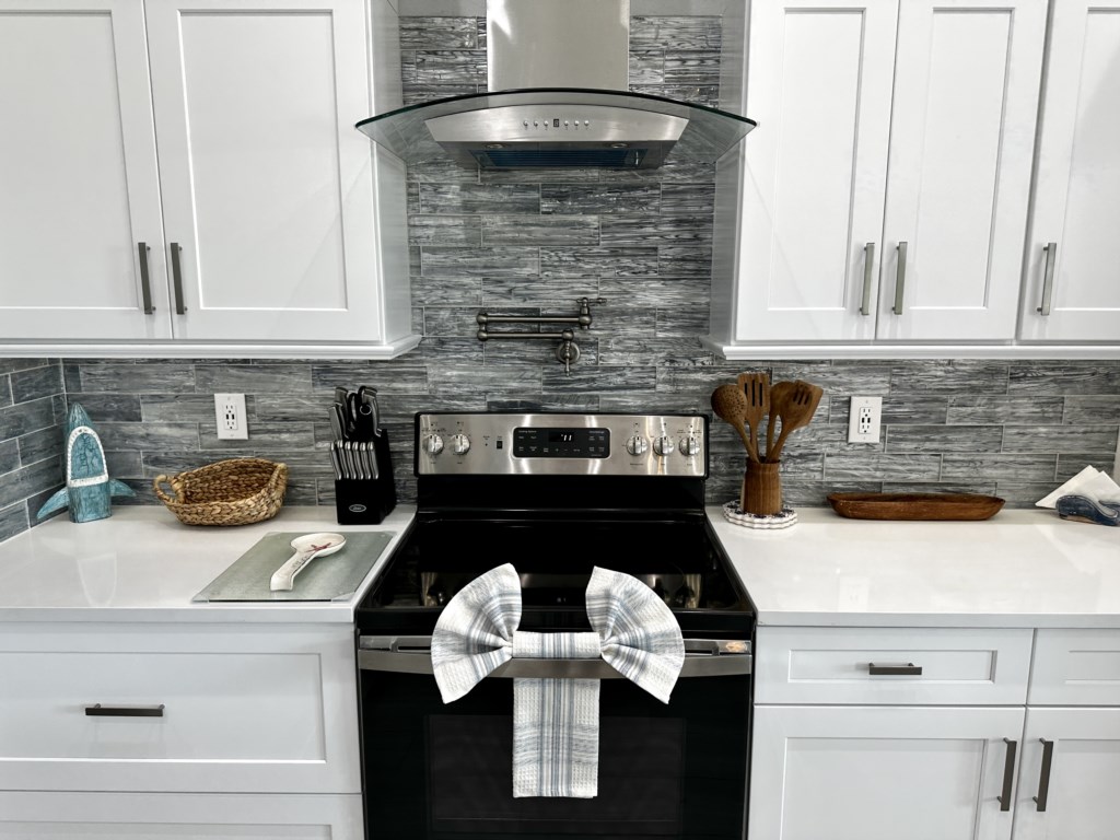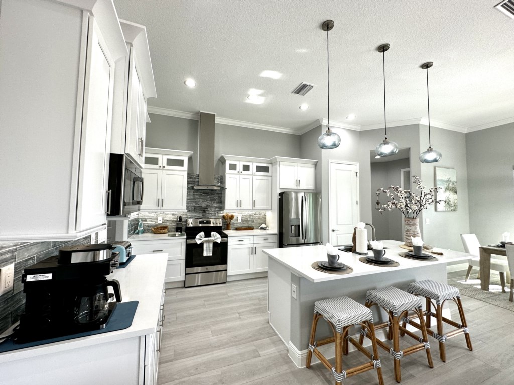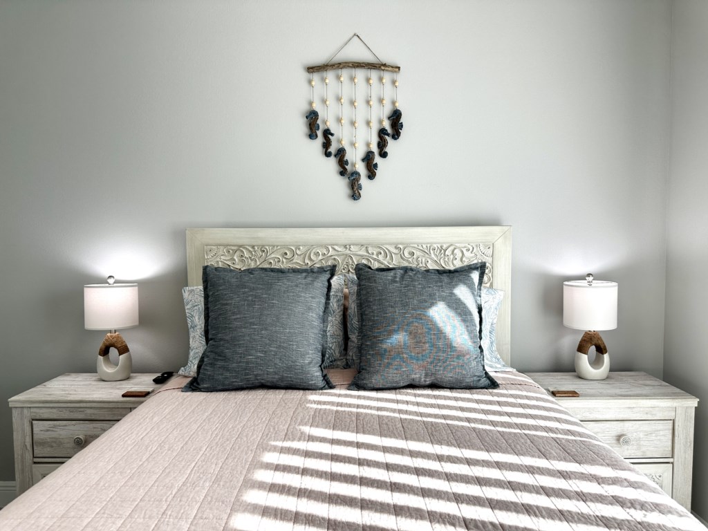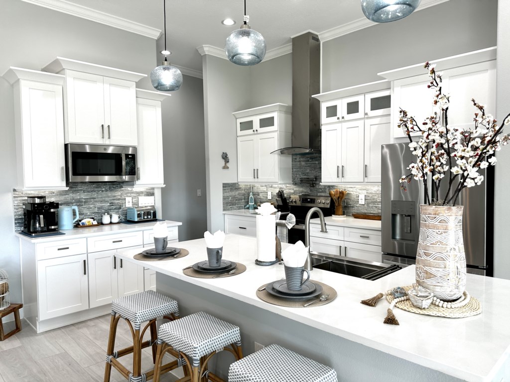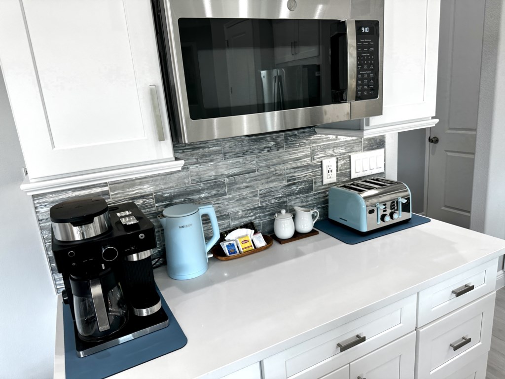 The open-concept kitchen and sunny dining area flow effortlessly into the living room, creating the perfect space for gathering, entertaining, and sharing unforgettable vacation meals. At the heart of the home, the kitchen is a chef’s dream—boasting an oversized granite island with bar stools, gleaming stainless steel appliances, microwave, dishwasher, and a spacious pantry for all your culinary essentials. Upscale touches include a dedicated coffee bar featuring a duo single-serve & 12-cup carafe coffee maker, an electric kettle, and everything you need to start your mornings off right. And for added convenience, the elegant pot filler above the range lets you fill pots with ease—no need to make trips from the sink. Whether you’re whipping up a beach-day brunch or hosting a laid-back dinner, this kitchen has everything you need to feel right at home, in style.