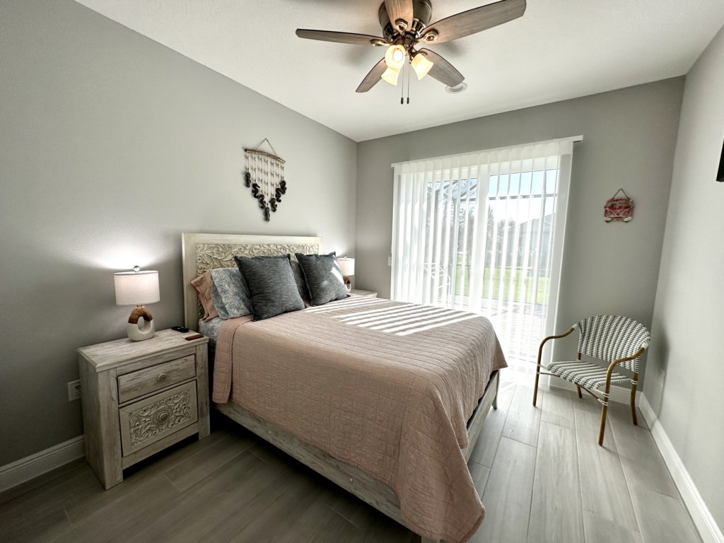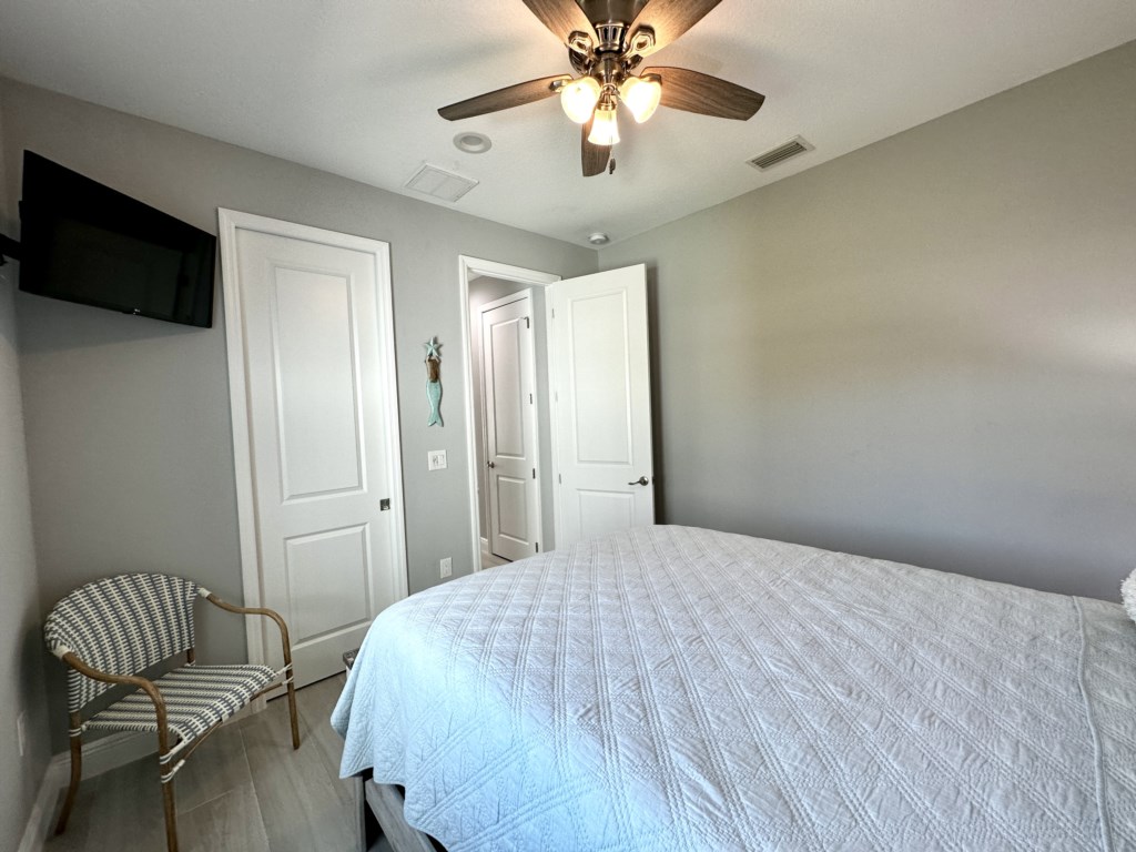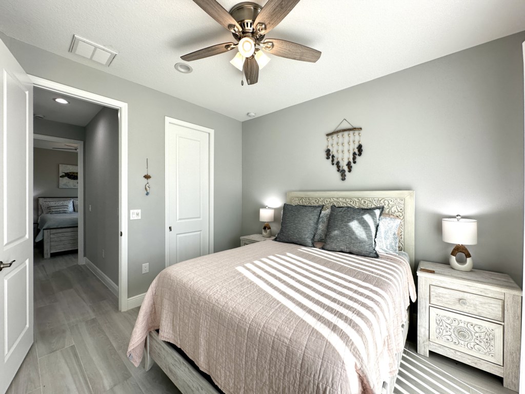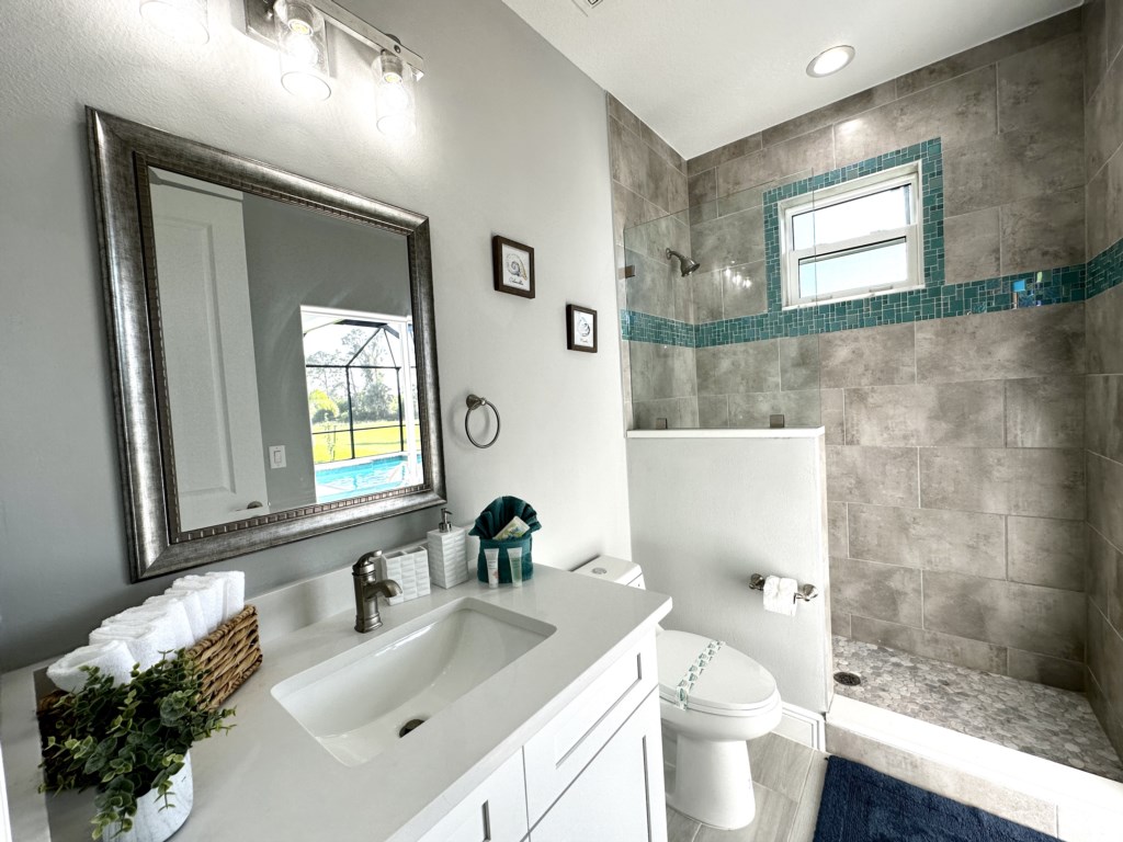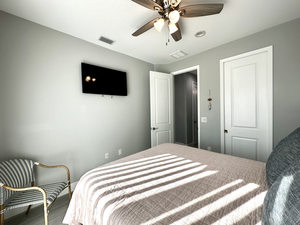 The primary suite is your own private retreat—featuring a plush king bed, flat screen TV, spacious walk-in closet, and sliding doors that open directly to the pool area for easy morning dips or sunset lounging. The en-suite bathroom adds a touch of spa-like elegance with dual vanities and a custom walk-around shower designed for ultimate relaxation. On the opposite side of the home, guests will enjoy their own private wing. The second bedroom offers a cozy queen bed, flat screen smart TV, walk-in closet, and direct access to the pool area. The third bedroom also features a queen bed, smart TV, and a generous walk-in closet—perfect for families or couples traveling together. The stylish family bathroom includes a single vanity, walk-in shower, and convenient access to the pool area. For your comfort and ease, all linens, towels, and pool towels are provided, and every bathroom is equipped with a hair dryer.