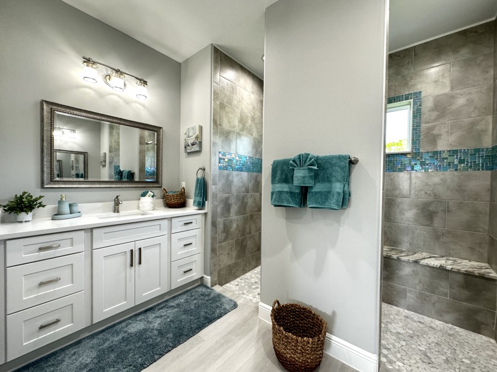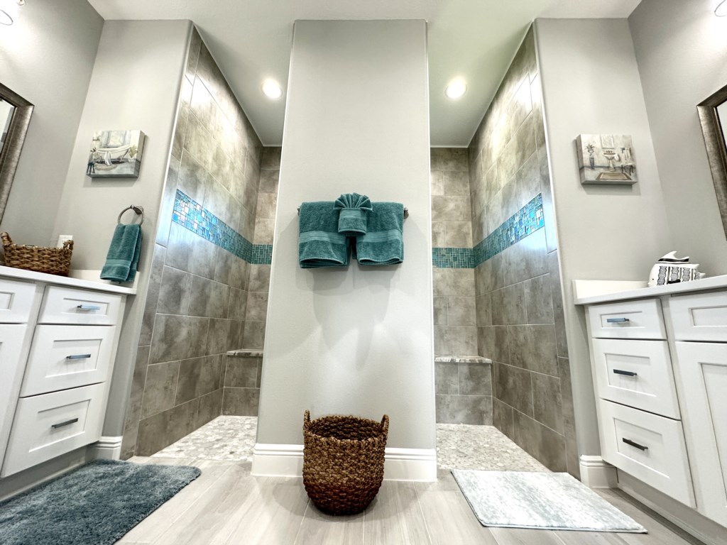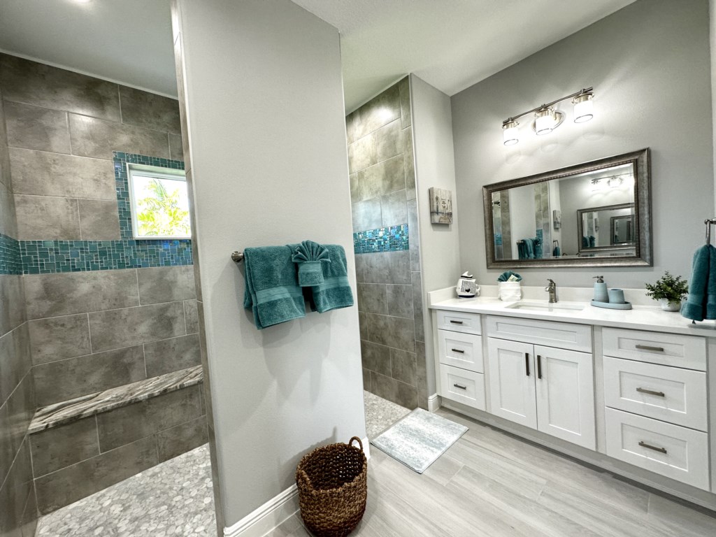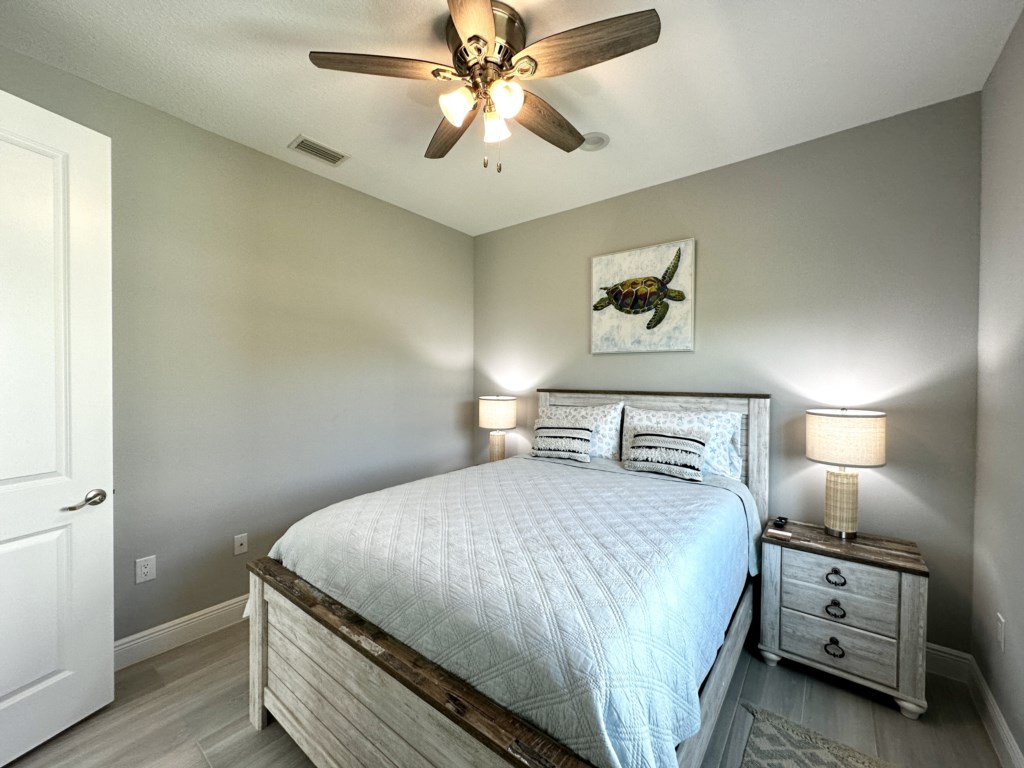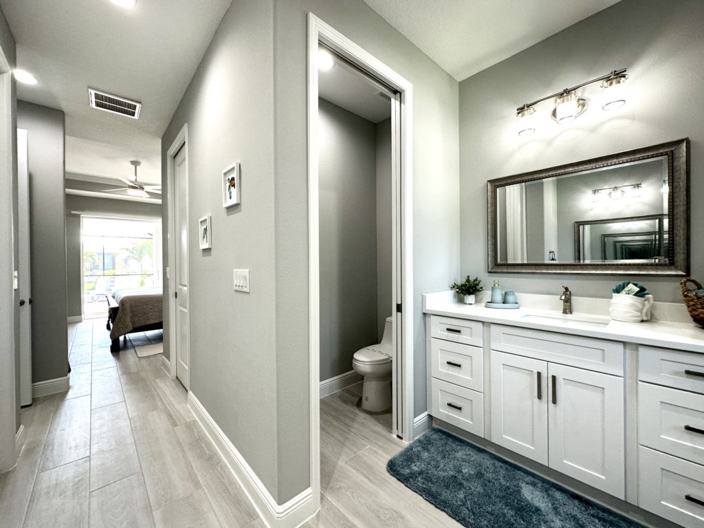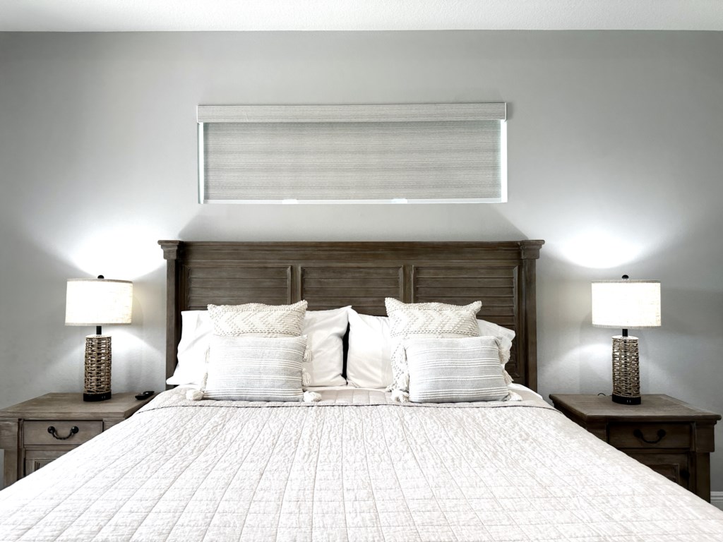 The primary suite is your own private retreat—featuring a plush king bed, flat screen TV, spacious walk-in closet, and sliding doors that open directly to the pool area for easy morning dips or sunset lounging. The en-suite bathroom adds a touch of spa-like elegance with dual vanities and a custom walk-around shower designed for ultimate relaxation. On the opposite side of the home, guests will enjoy their own private wing. The second bedroom offers a cozy queen bed, flat screen smart TV, walk-in closet, and direct access to the pool area. The third bedroom also features a queen bed, smart TV, and a generous walk-in closet—perfect for families or couples traveling together. The stylish family bathroom includes a single vanity, walk-in shower, and convenient access to the pool area. For your comfort and ease, all linens, towels, and pool towels are provided, and every bathroom is equipped with a hair dryer.